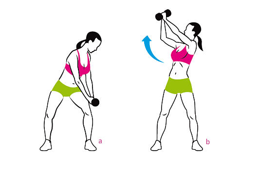 Arme gestreckt lassen, die Hantel über der rechten Schulter nach oben schwingen, Beine lang machen. Dann Bewegung umkehren.
