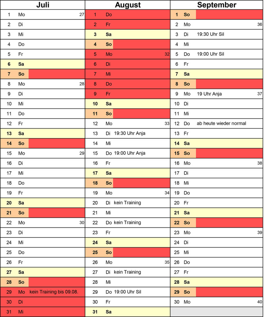 Sommer Trainingszeiten v. Anja, Katharina und Silvia