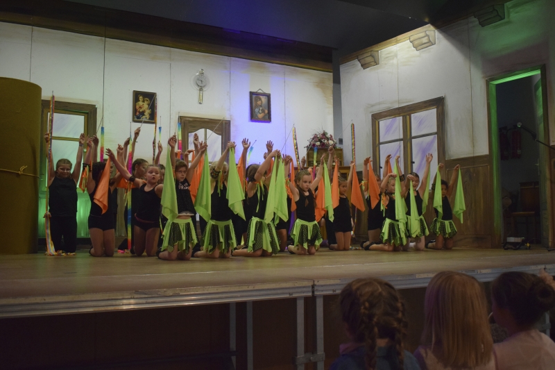 Dann wurde es eng auf der Bühne. Die große Gruppe von Hedwig Fritz präsentierte einen tollen farbenfrohen durch Tücher und Bänder bereicherten Tanz und zeigte anschließend mit fetziger Musik unterlegt, was sie beim Bodenturnen so alles können.