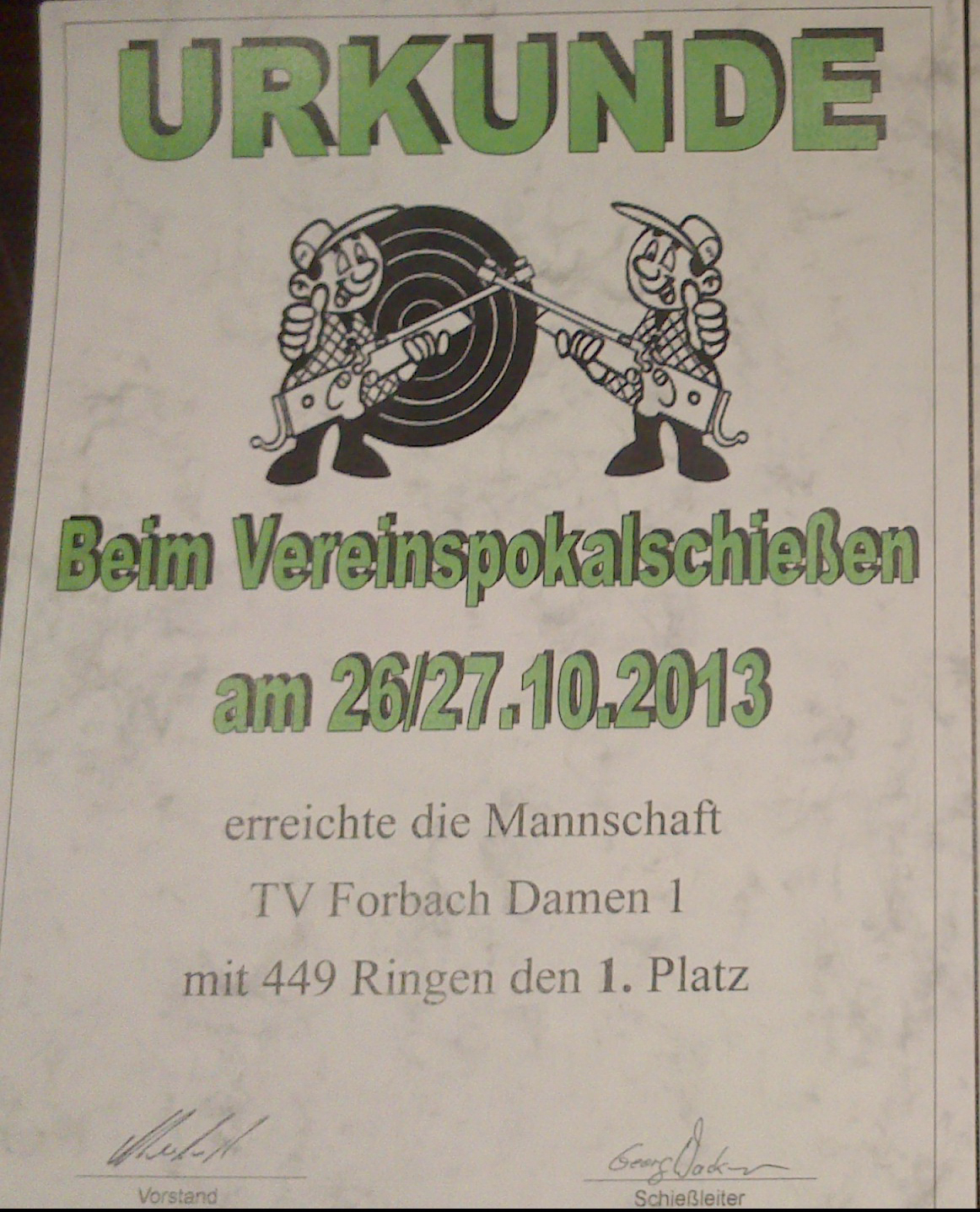 Die Damen des TV Forbach nahmen am Wochenende mit zwei Mannschaften am Vereinspokalschießen teil. Schon seit vielen Jahren sind sie mit zwei Mannschaften bei dem Turnier dabei und konnten fast immer einen der ersten drei Plätze erreichen. Nachdem man im letztes Jahr den Sieg nur knapp verpasst hatte, konnten sich die Damen der 1. Mannschaft gestern Abend bei der Siegerehrung über den 1. Platz freuen. Die 2. Mannschaft erreichte den 7. Platz. Bemerkenswert ist auch der 1. Platz von Heike Schillinger in der Einzelwertung der Damen, die ebenfalls seit vielen Jahren für die 1. Mannschaft der TV Damen am Start ist und zur guten Platzierung der Mannschaft beiträgt.